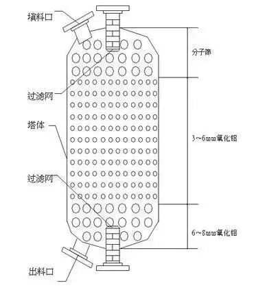 (9)采用活性氧化铝作为分子筛的保护层。在分子筛的上层填加活性氧化铝,用其首先将天然气中携带液态水、液烃和其他有机物进行吸附。